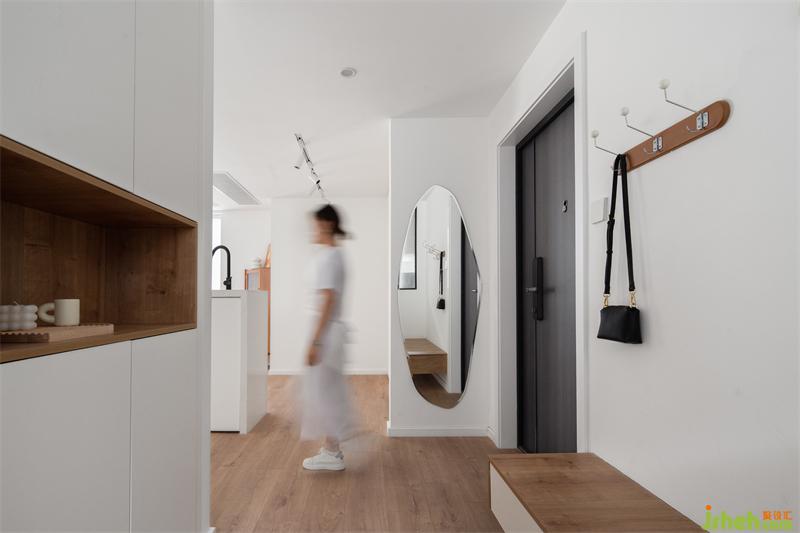 左右两侧分别以一组白色玄关柜+一组杂物柜满足玄关区域与生活阳台区域的收纳。