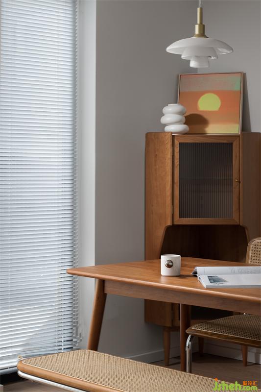 转角处,搭配一个多功能复古异形柜,材质呈现与餐桌相仿。木材会随时间的推移变得越来越焦糖色,带来的不仅是温润舒适感,还能给家里增添一丝VINTAGE的气质。