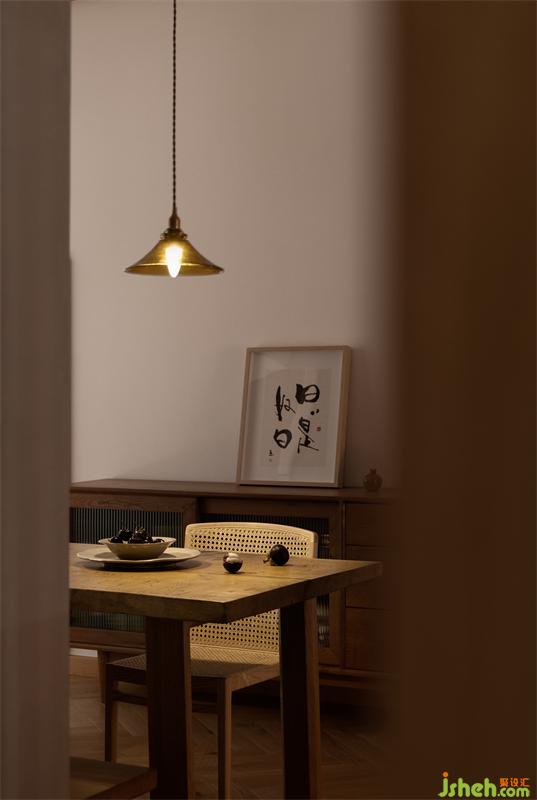 岛台+餐桌的组合大大的增加了餐厅利用率,岛台日常也被屋主作为放置茶具品茗使用。2张藤编餐椅与长条木凳,满足4-6人的用餐需求.搭配樱桃木定制斗柜作为餐边柜补充餐区收纳。