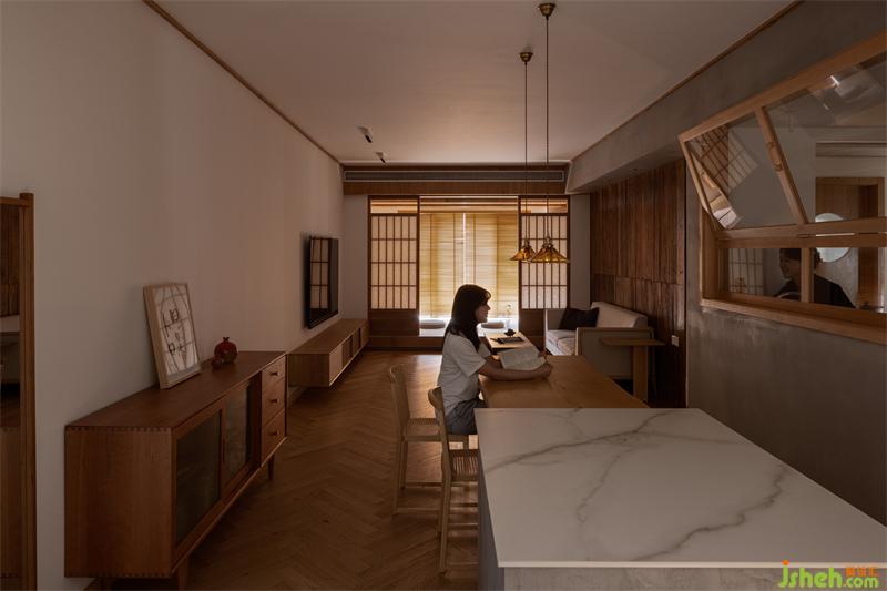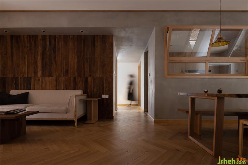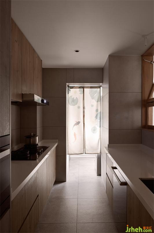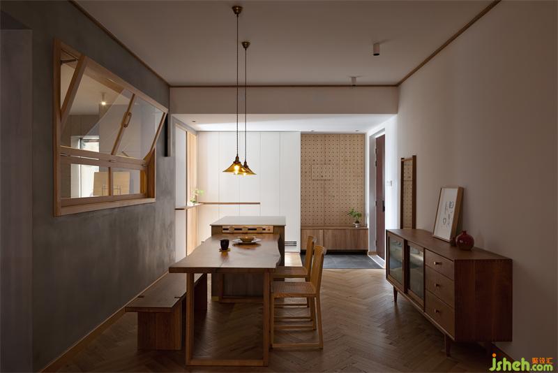 选择纹理细腻、颜色温润的榉木作为厨房半开放式窗框这两个区域的主要木材,中和了老木材的稳重与年代感。