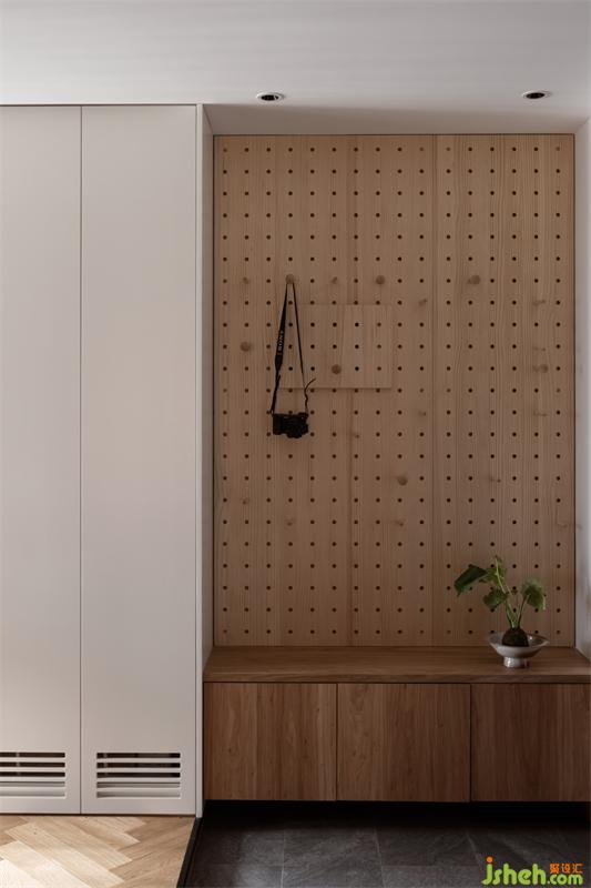 玄关选择了淘宝定制的高性价比松木洞洞板,和自有品牌U然木作的5门定制收纳柜,以组合的形式满足入户区域的公共收纳。