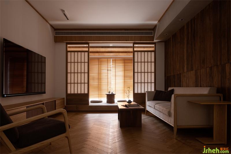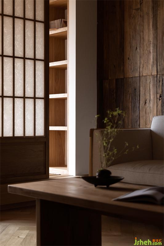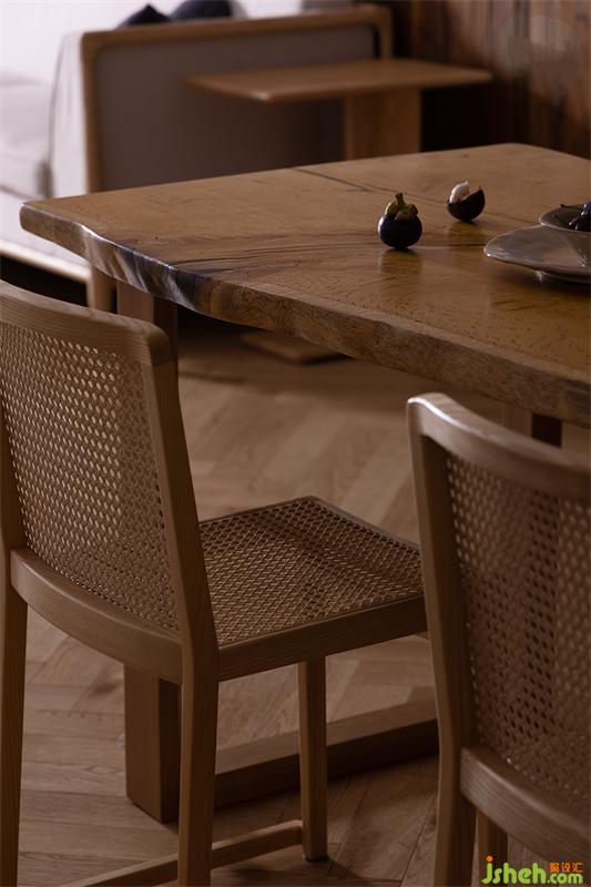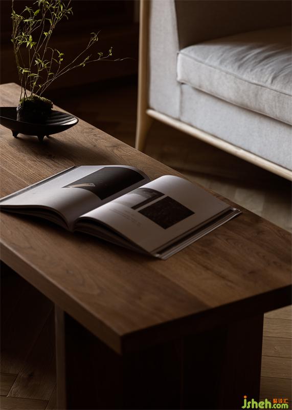 白蜡木边几与黑胡桃木茶几,甚至是白橡木地板,从人类最原始的居住出发,与自然毗邻,客厅区5种不同木材的搭配,似乎透露出些许“京都安缦”的意韵。