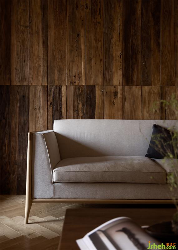 沙发背景墙的老榆木,是从二手市场淘回来的。在保留其原貌的基础上,做了一些防腐防潮措施后上墙,与梵几的木框两座沙发呼应。