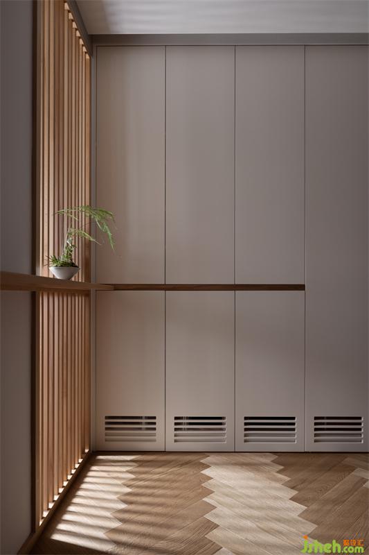 选择自然且触感温润的榉木做格栅,分隔玄关与生活阳台。保证玄关两侧采光的同时,也可保证美观与空间的独立性。