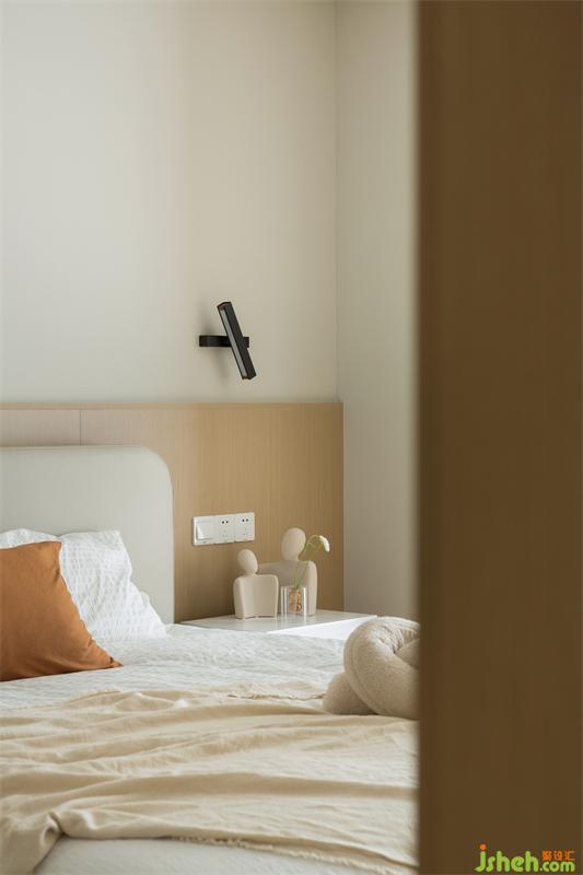 更加私人化定制,从而打破传统精装房千篇一律的风格。顶部拆除了多余的石膏线条,保留部分筒灯区域去照明。铁艺帽子灯与水泥球床头灯的配合,丰富空间造型。