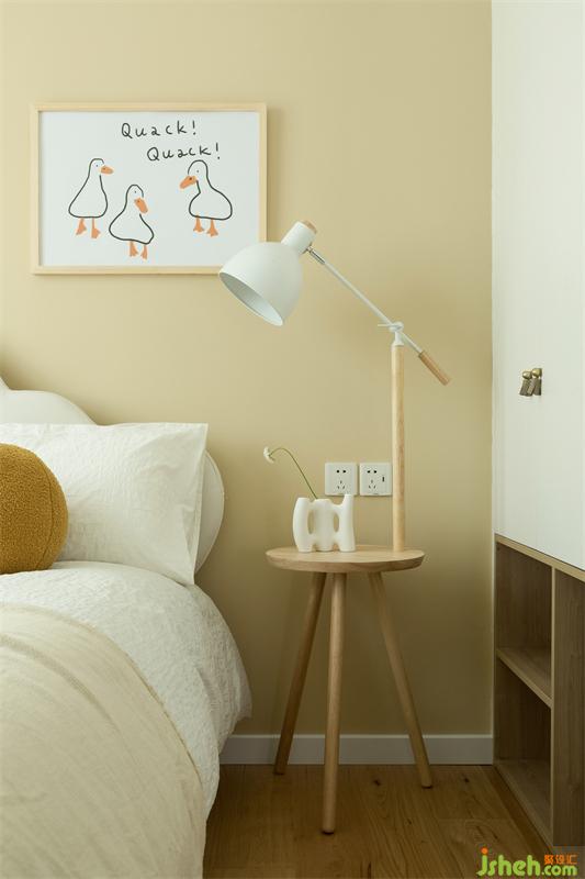 在精装房改造儿童房时最能勾起童心,软糯的奶黄色作为儿童房的主色调(背景24YY 63/200),云朵造型的儿童床与三只小鸭子挂画,无一不预示着小两口对新生命的美好期待。