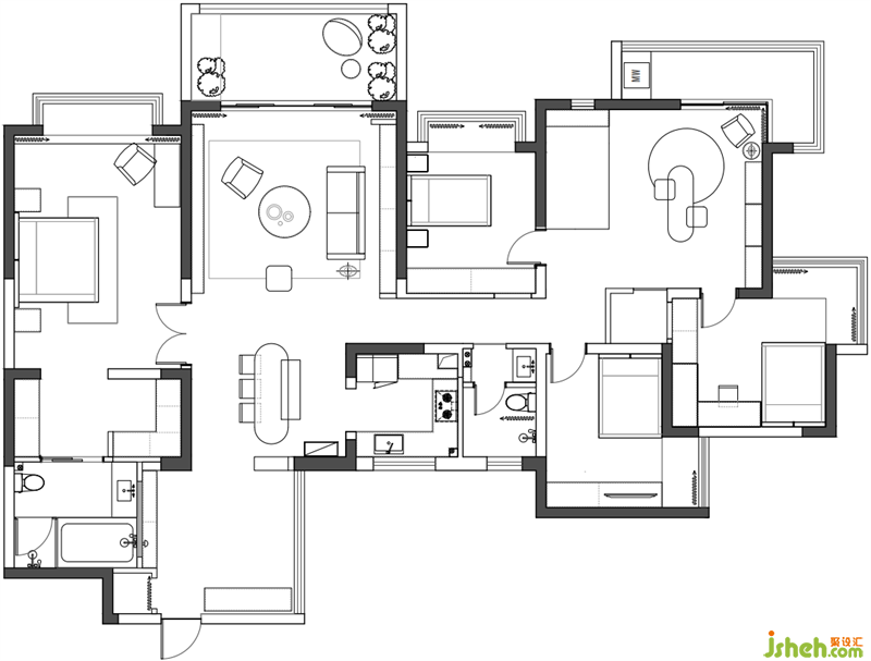 ❶ 布局划分:以客厅为分割线,将主卧室和其他区域划分开来。即使一家人在同一屋檐下,但也能有各自安静且独立的空间。