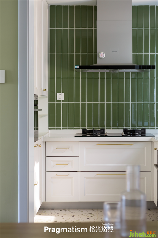 厨房以白色橱柜+荷叶绿面砖为主基调,冰箱、烤箱等等做嵌入式设计,尽可能的减少因为厨房较小的空间面积,所带来的局促感。
