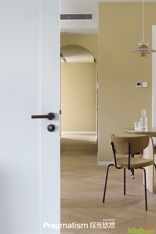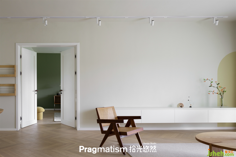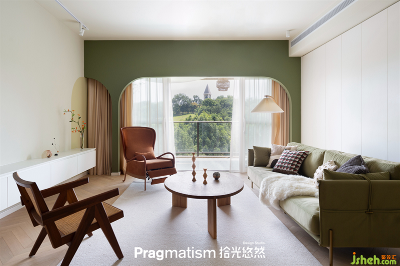 客厅在布局上并未做太大的拆改,只是通过软装及色彩搭配,还有墙体的弧形元素来重新打造这个空间。墨绿色的双门洞作为一抹亮色融入其中,通过连接门洞的拱形分色墙做一个自然的延伸。