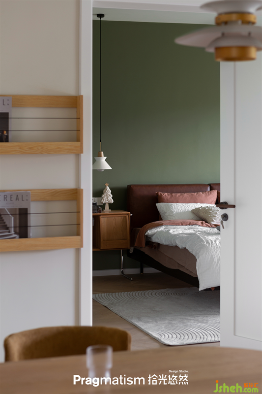餐厅靠近主卧的墙面上设计了两排杂志架,既方便拿取杂志满足碎片阅读的需求,也作为装饰点缀了餐厅。