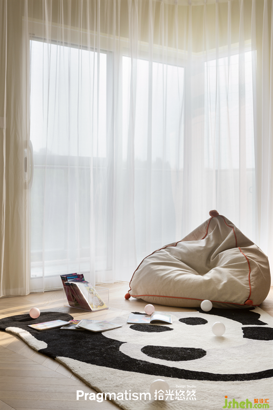中间摆放卡通的熊猫地毯和懒人沙发,一家人或席地而坐、或躺进沙发,享受每一次的亲子时光。