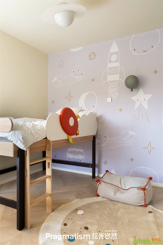 儿童房以童趣为主题,选用卡通墙纸、造型可爱的软装,男孩房床体下方空间可作为储物或小朋友的玩耍空间。