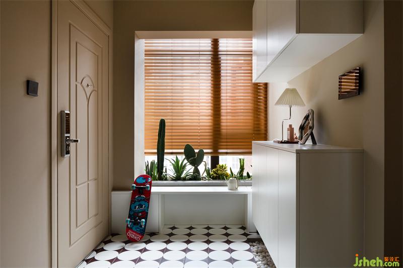 一进入玄关区域,映入眼帘的便是地面的复古花砖,与天然的鹅卵石装饰。为了解决入户的收纳,除了设置了一组玄关柜作为收纳,同时靠窗的区域考虑了具备收纳功能的换鞋凳。