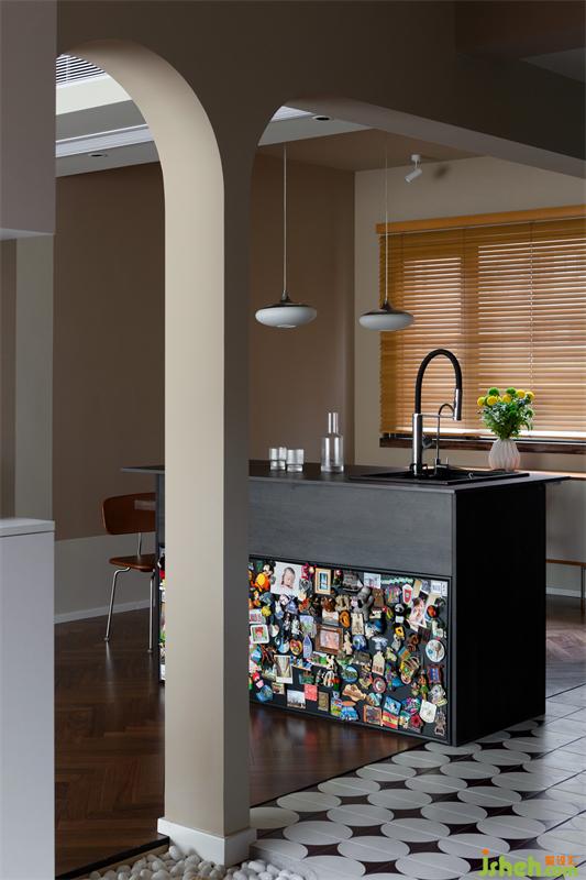 L形的岛台与餐桌一体,充分利用餐厅空间。岛台位于玄关、厨房、客厅及餐厅的交汇点,巧妙地分隔开四个空间,并与过道一同形成房屋的轴线。