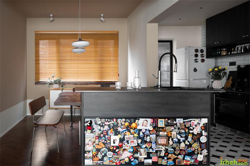 厨房区域选择了深色的橱柜,女主人摆放上悉心挑选的炊具后,色彩的碰撞呈现出复古的味道。