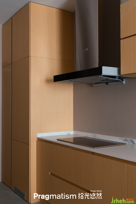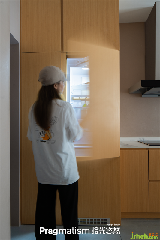 小户型更需考虑整洁度和空间的利用率,因此在设计上,大部分家电采用嵌入式处理。冰箱隐藏在入户左侧柜体内部,下方预留出通风口,同色的木饰面体现出一体化的美感。