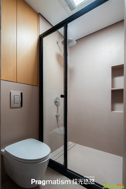 拾光悠然设计沿着进门右手边的弧形墙体,推开与墙面同色的隐框门,即进入卫浴区。卫浴区吊顶脱缝产生悬浮感,墙面和地面全部使用微水泥,质感自然细腻,通体无缝更美观。