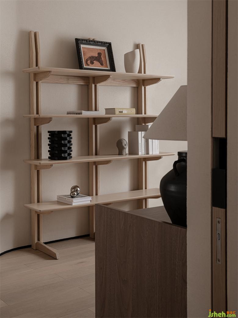 没有大体量的柜体设计,让空间还原到舒适的尺度。书桌靠卧室极近,就算屋主专注地查阅资料到深夜,起身只需几步,就能到达自己的睡眠空间。