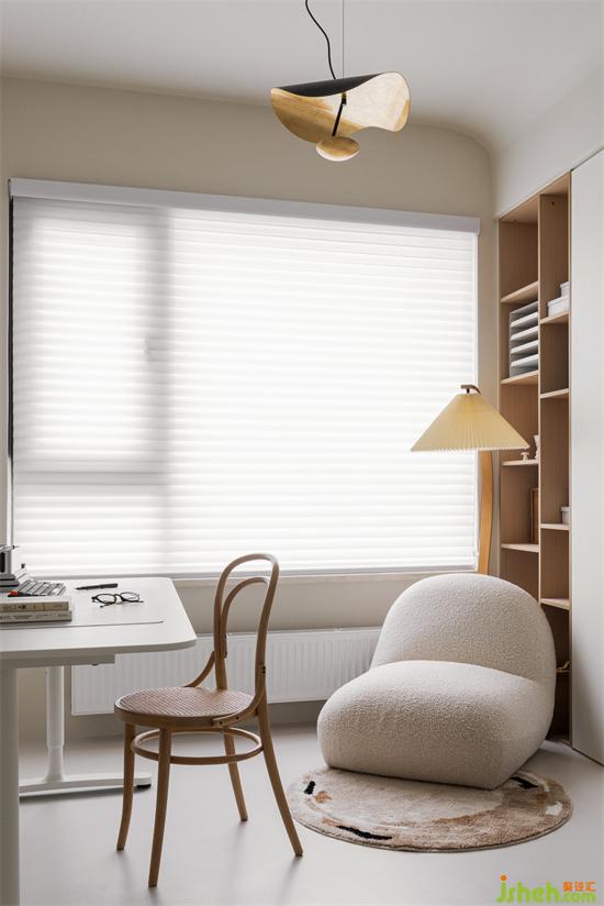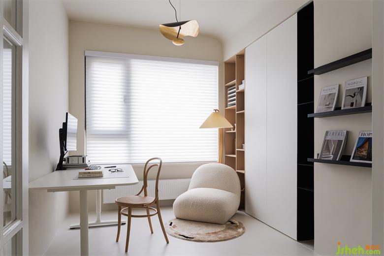 选择成品书桌,后期若有其他的临时需求(住宿、儿童游玩等),也可灵活应对。家装设计折叠门+开放格,扩大了书房在视觉上的尺寸。