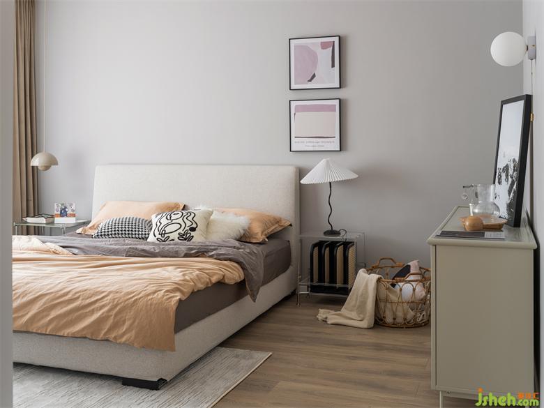 卧室以温馨、宁静为主基调。家装设计木地板换为更接近原木色的,墙漆、床品及窗帘都选择低饱和度,床头柜、灯具及装饰画都是小体量的,不会产生厚重的压抑感,对于提升睡眠质量也有一定裨益。