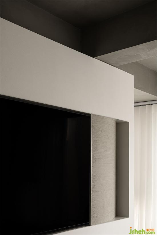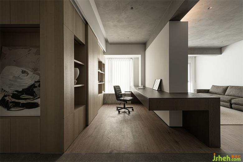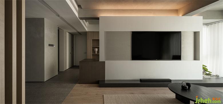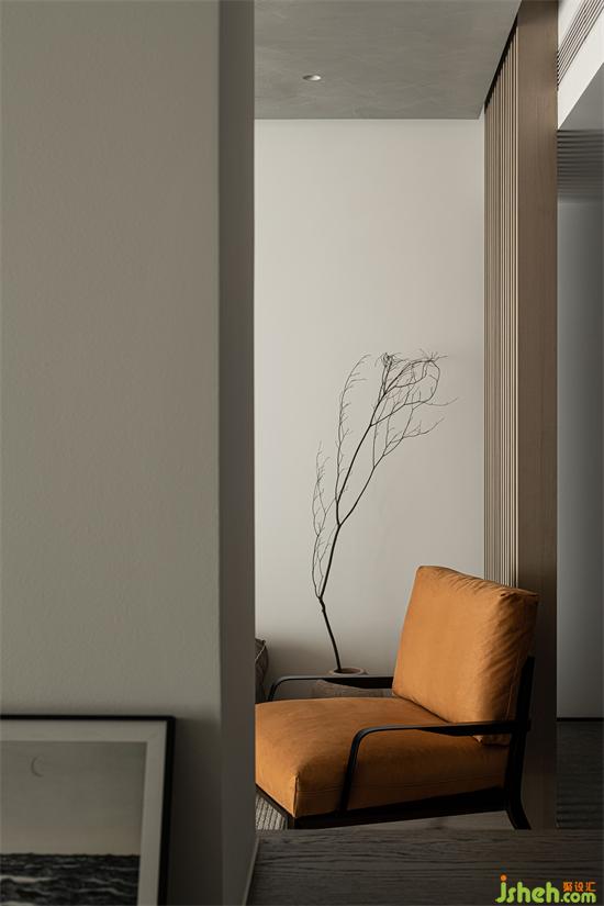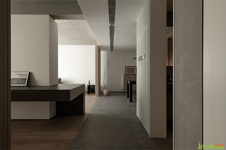以过道为界,温润的木地板和沉稳的地砖,自然分隔休闲区和烹饪区;两侧层高不一,便在客厅一侧选择深色艺术涂料,形成“下沉”的视觉效果,家装设计https://www.jsheh.com/list/home/保持整体的协调性;不同光束角的灯光照耀,也让空间更具层次感。