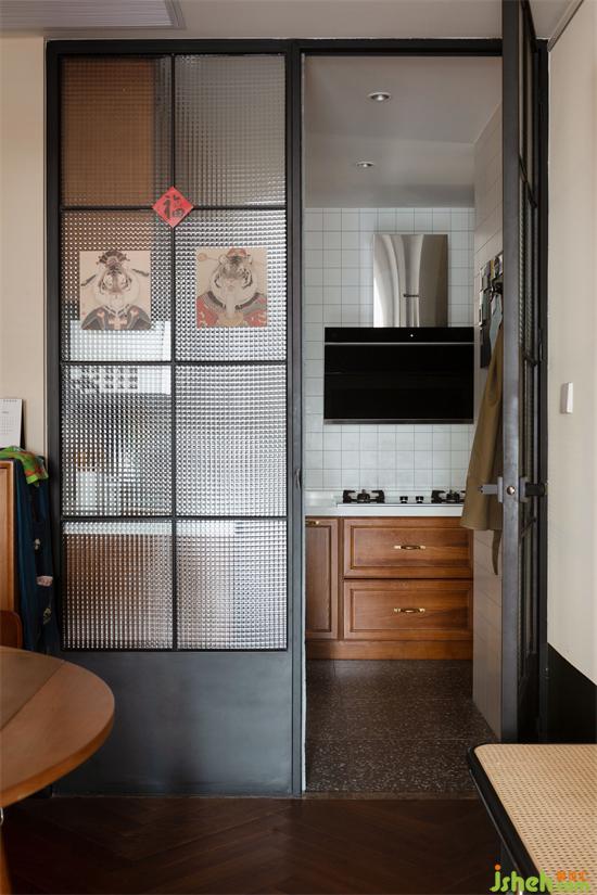 厨房里复刻了旧时代常见的小方砖,双方格压花玻璃以及传统色系的水磨石,家装设计这些旧元素以新的搭配形式展现,还原妈妈熟悉的烟火气。