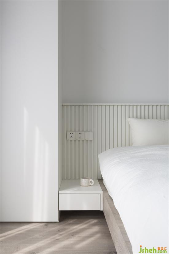 床头与两边的衣柜融为一体,采用墙面同样的颜色,成都家装设计减少凸出的衣柜给人带来的压抑感。