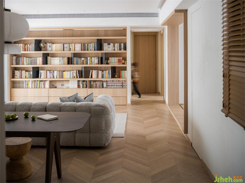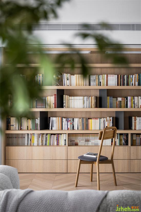 全屋的非成品柜皆为自有品牌“U然木作”定制安装。大面积的书柜,超长的抽屉,成为他们存放书籍的地方。
