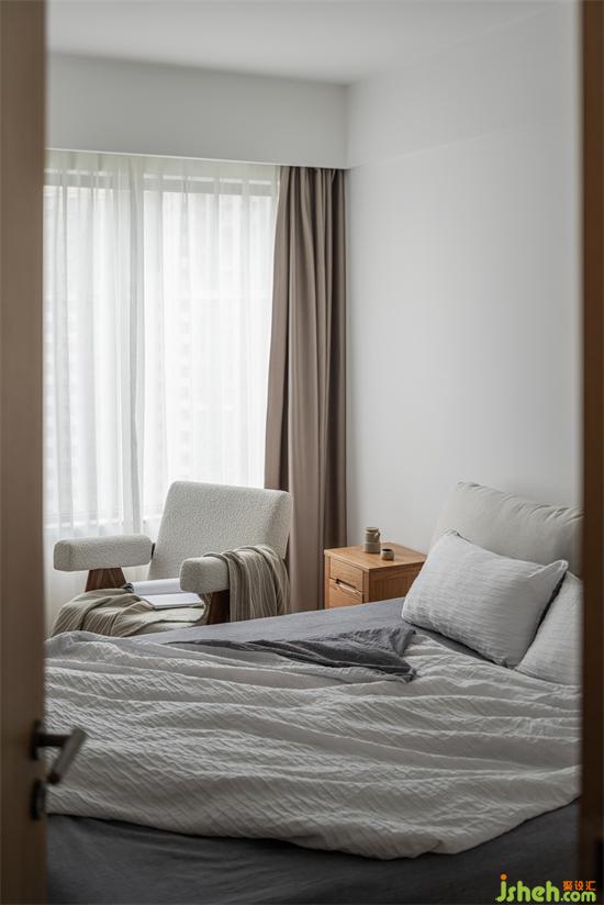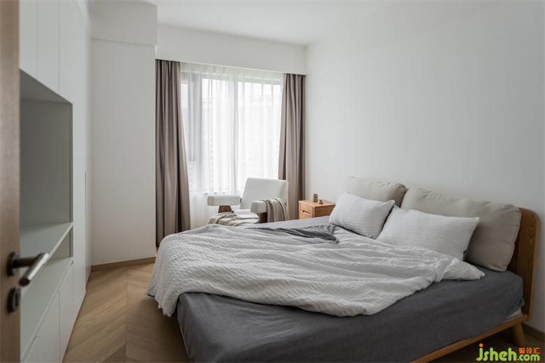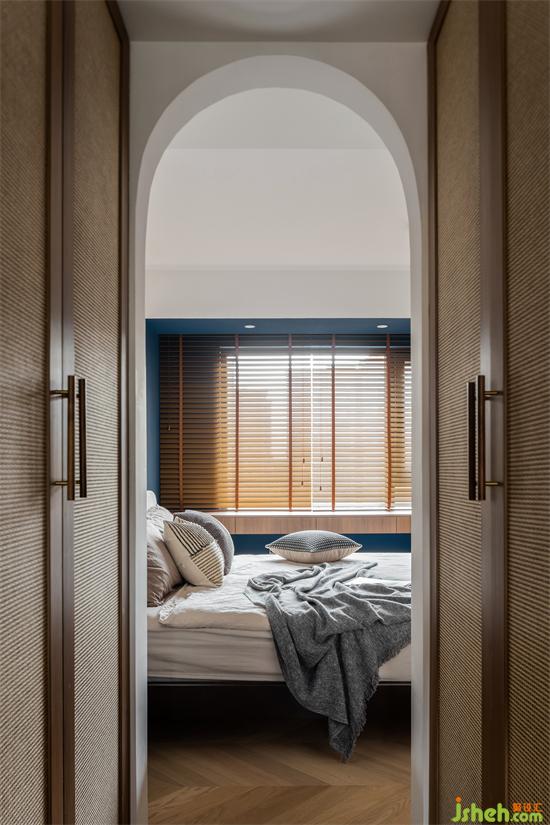 衣帽间向卫生间扩张,增加了卧室的衣物储物需求,家装设计同样采用藤编柜门,为屋主营造舒适自然的环境。