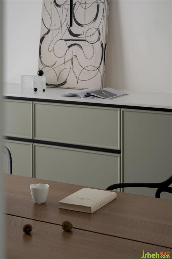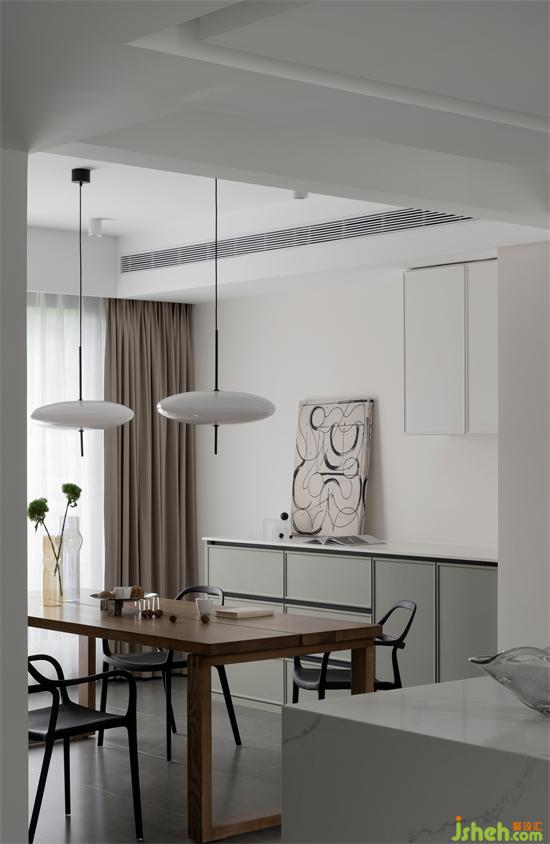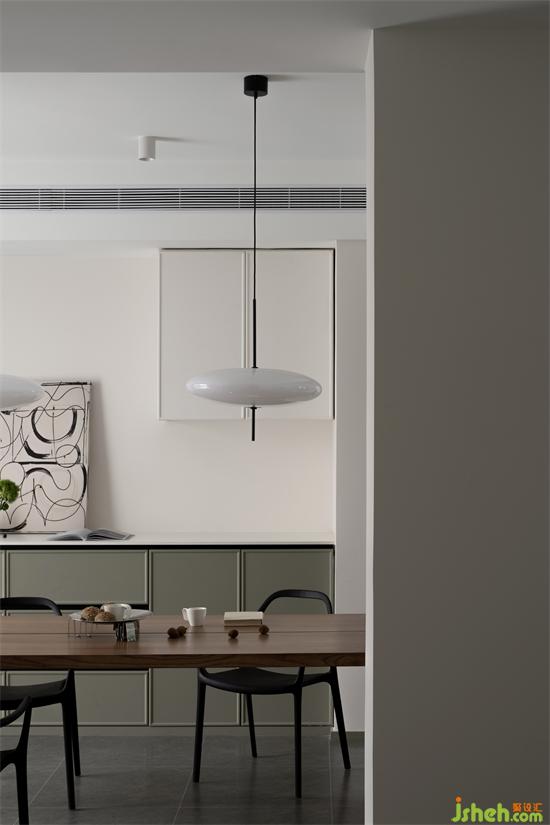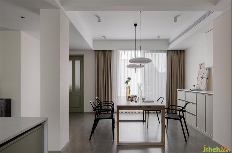家装设计调整了餐厅区域的位置,让整个公共区域视野宽阔,与厨房在走廊左右两侧分布,让做饭、就餐的空间动线便捷、合理。