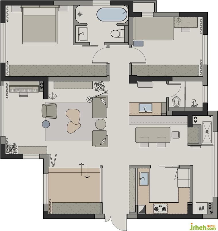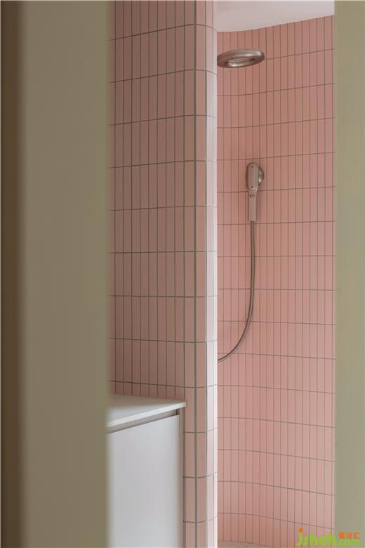❷ 主卧墙体挪位,扩大主卫面积,大胆尝试猛男最爱的粉色运用于主卫,私密的空间拥有更多的生活仪式感