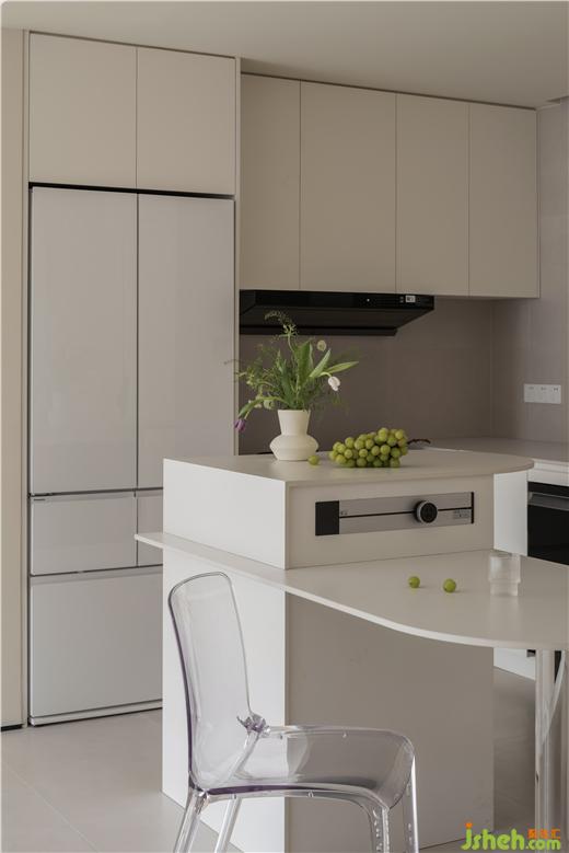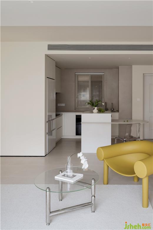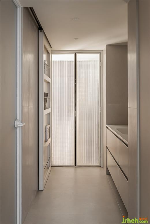 于是设计师将阳台的部分墙体拆除,打开入户的视线,获取美观的入户体验。同时,将主动线上移,扩大走廊尺寸,使全屋动线具有更好的舒适性。