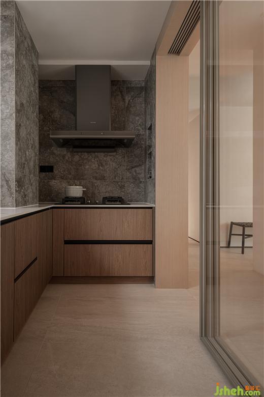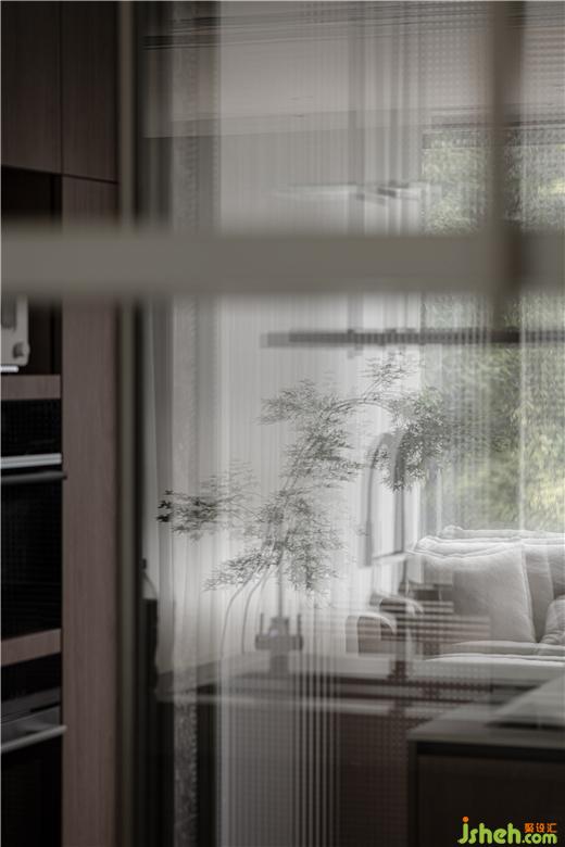 “侘寂”美学的本意在于营造沉静的氛围,而餐厅则想更多呈现出一种市井烟火的气息,空间产生对比的同时也具有戏剧性。岛台+餐桌整个区域,看似简洁的造型,为了达到横平竖直的一一对应。