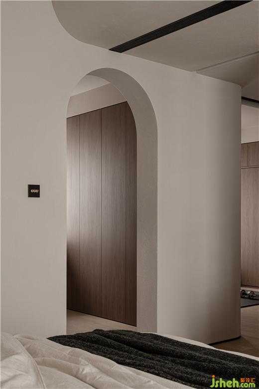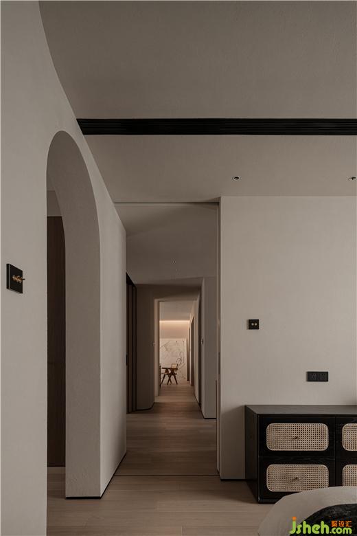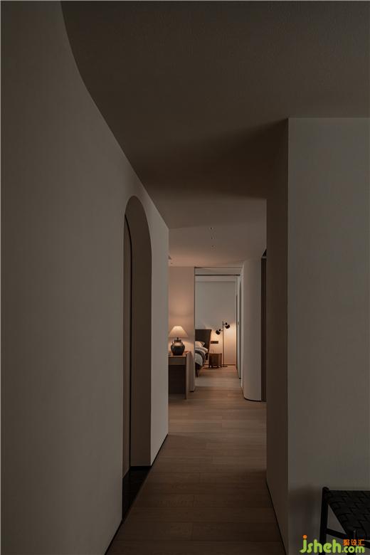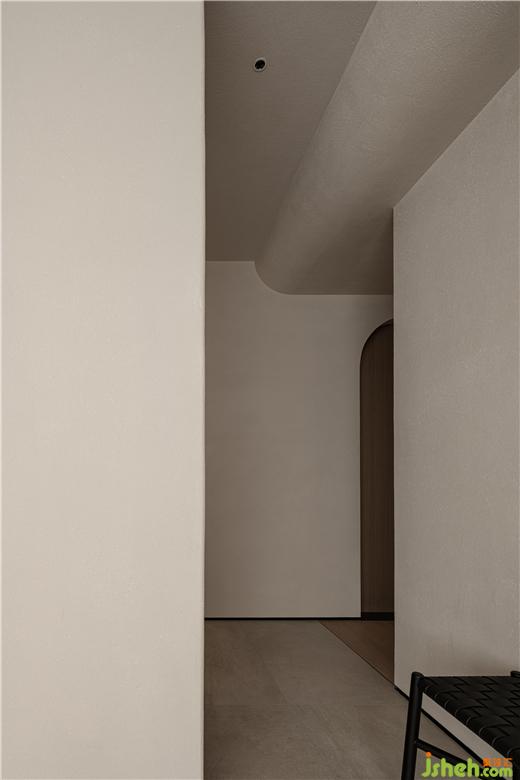 阳台纳入客厅空间,利用弧线造型包裹原本阳台的梁与柱,柔和的过渡使得空间线条感更为流畅,视觉层次感更为丰富。沙发临窗而置,即为了更好的视野,也是为了营造出更为惬意的空间意境,在日常生活中难以得到的状态。
