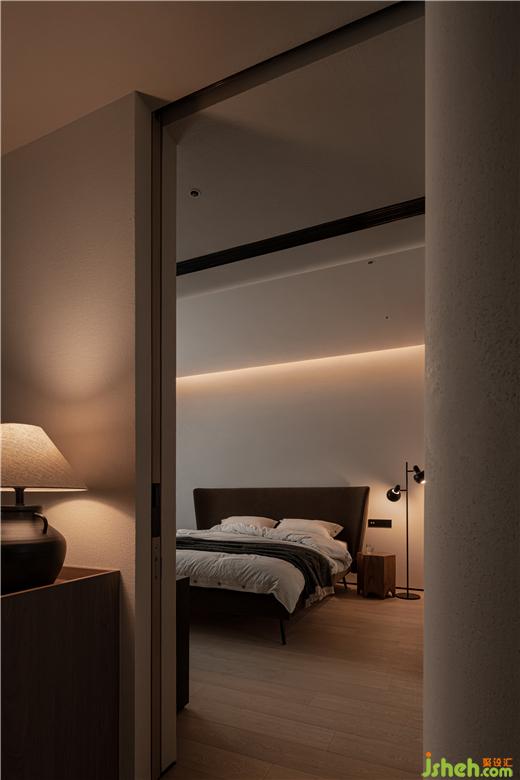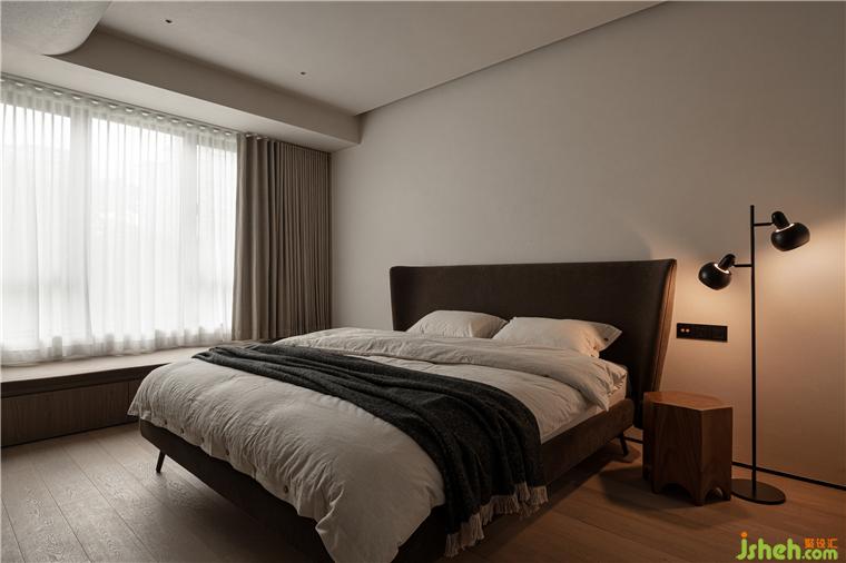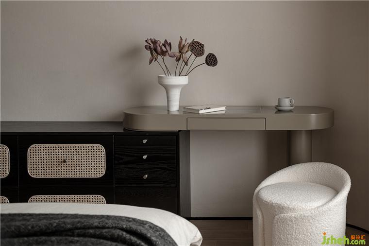 主卧延续整体空间设计的自然朴素质感。应对屋主的梳妆和储物需求,在床尾特别设计了斗柜+梳妆台的整体成品家具,成都香悦府装修设计将空间的尺度把握得恰到好处。
