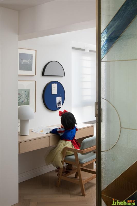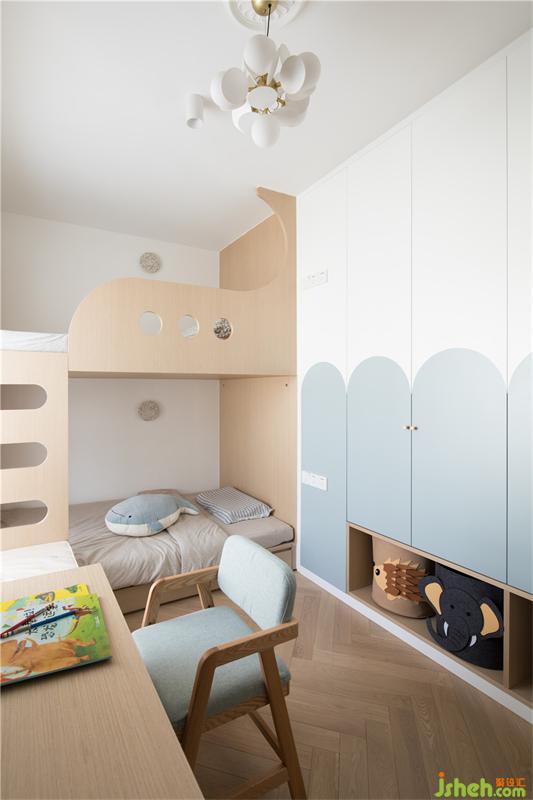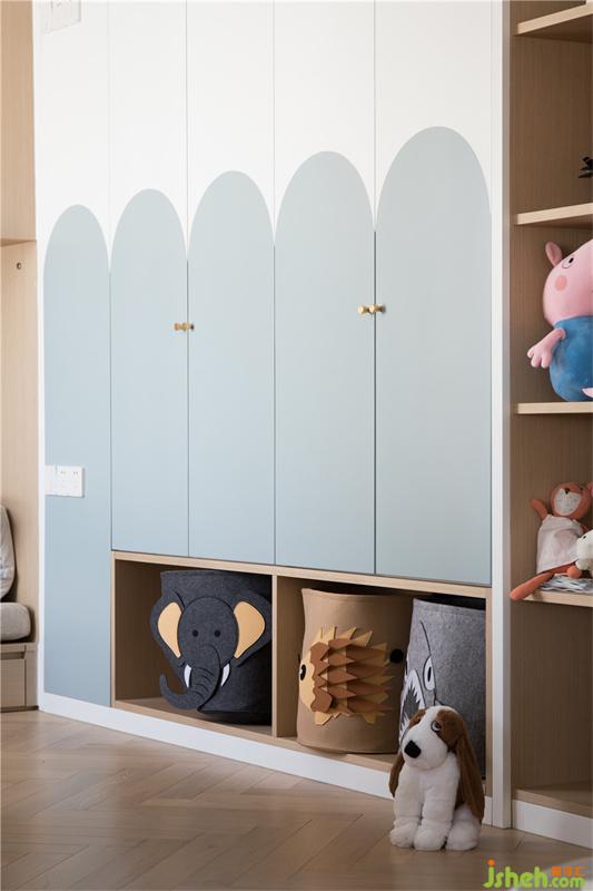 衣柜上半圆形的色块,浅浅的蓝色是小朋友柔柔的美梦,也呼应着海浪的主题,下面特意空出来的玩具整理盒,更有利于小朋友养成自己收拾玩具的良好习惯。