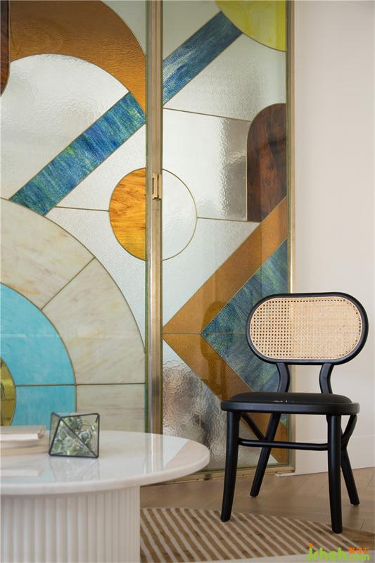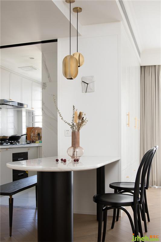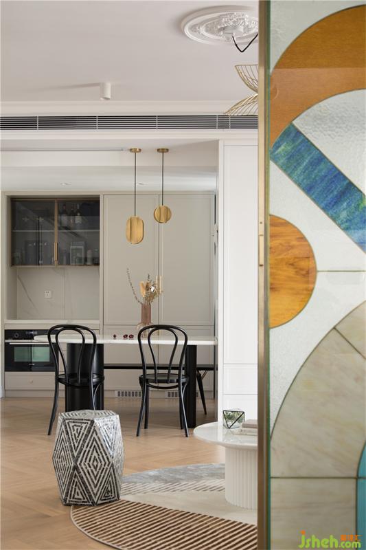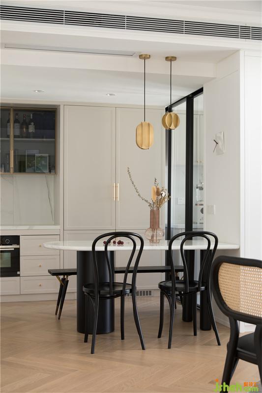 透过屏风看餐厅,西厨台面旁边是两扇隐藏式冰箱门,这样让空间更加整体风格更加统一和谐。