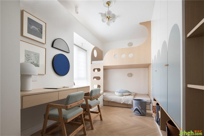 特意将凸窗的高度拉平和写字台一样宽,铺上软垫,这样小朋友多了一个能半躺着看书的地方,法式装修设计双层床的楼梯刚好设计在这个台面以上,也减少了楼梯的踏步。通过两个圆形的透光孔,小朋友也能来回的钻洞玩耍,十分欢乐,这是用于这种双层床靠近凸窗的比较特别有趣的处理范例。 而上下床的设计也增加了小朋友之间的互动空间,让他们的童年更有趣和难忘。