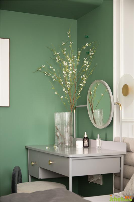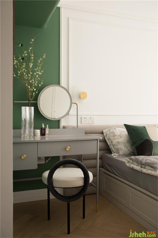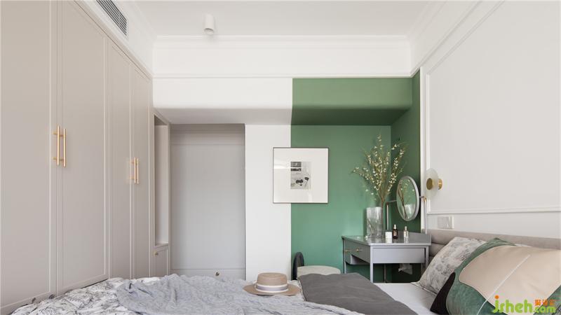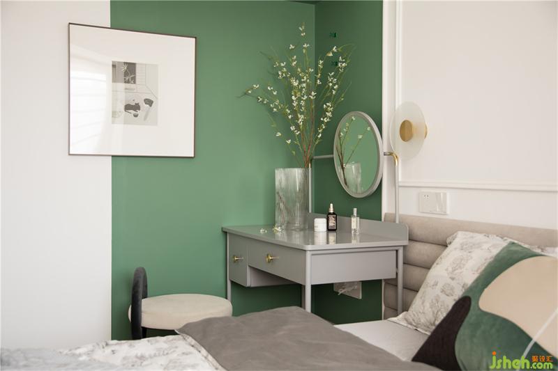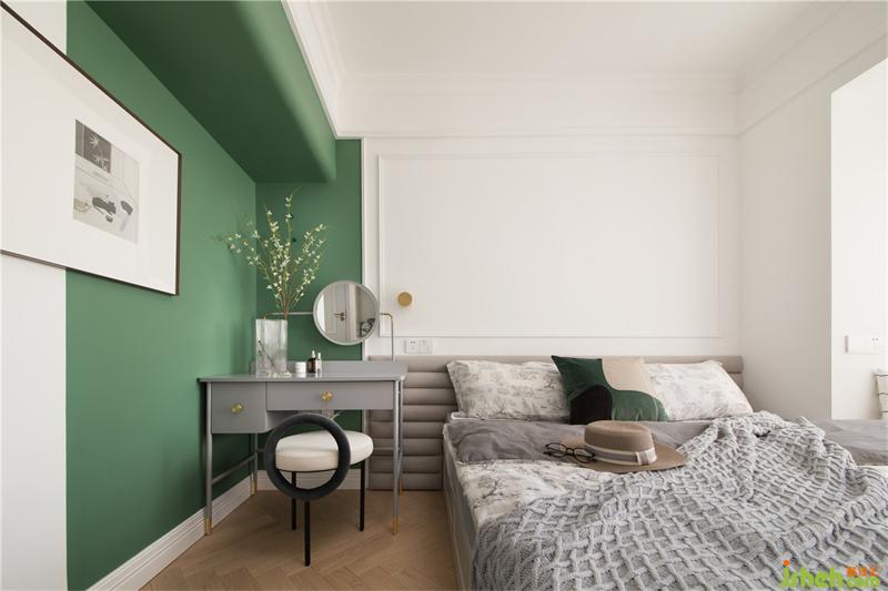 主卧通过简单的绿色局部粉刷以及线条框和软包的组合,让原本局促的主卧,也显得特别的有格调。