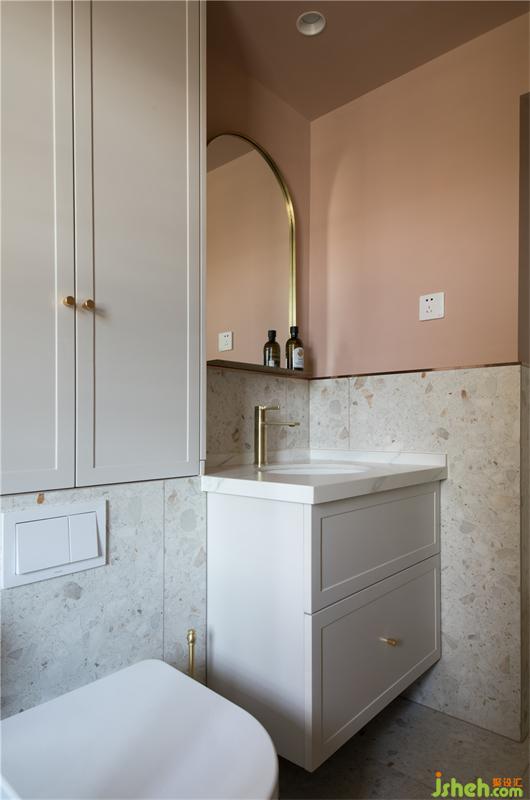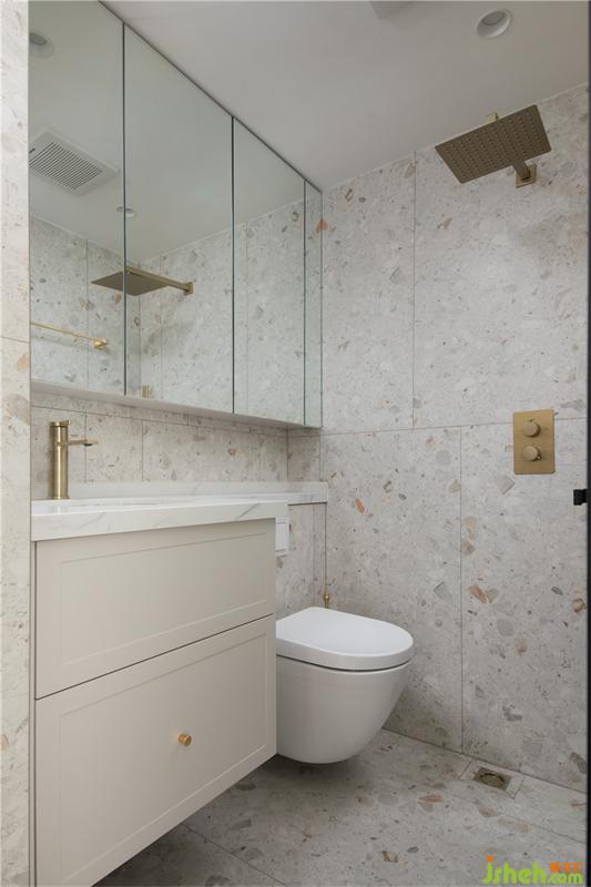 公卫的水磨石和脏粉的结合,空间视觉上立马就变得温馨起来,马桶的上面设计了收纳柜隐藏在镜子后面,这样整个空间实际使用都会更加干净整洁。