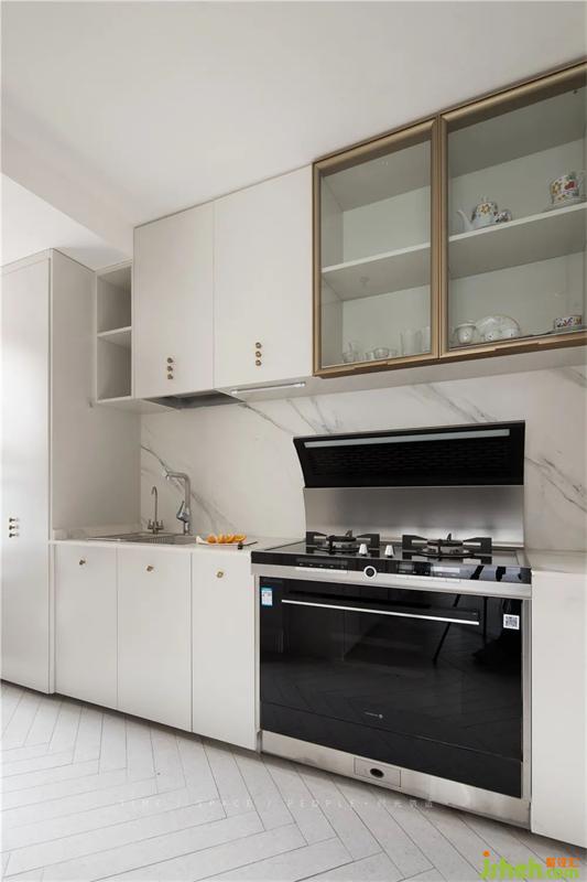橱柜拉手的阵列式排布,让拉手也成为柜门的装饰,隐藏式滤水篮的设计,让功能兼顾美感。浅灰色水磨石的人字铺搭配白色大花纹岩板,让厨房大气又充满细节。