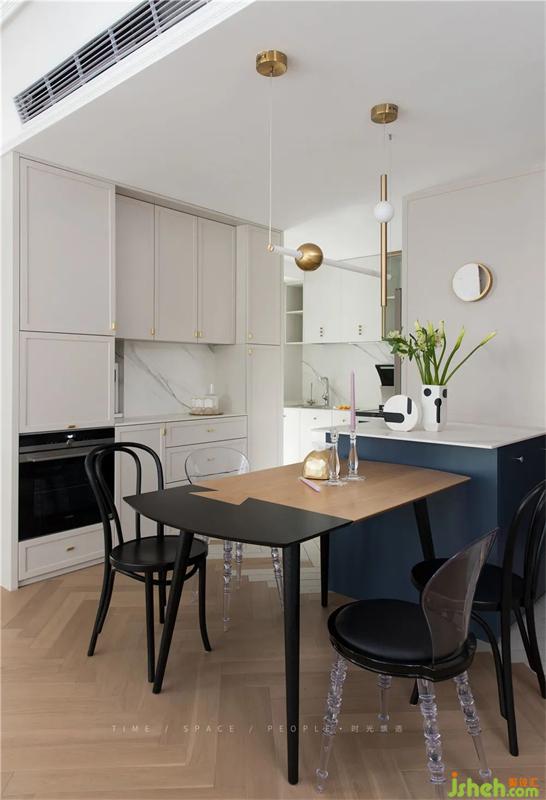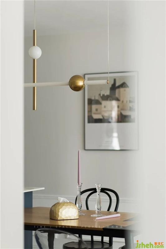 燕尾式拼接的餐桌和黑色的14号椅特别搭配,我们特意配了一张透明亚克力椅背的餐椅,减少椅子的存在感,增加空间的尺度感。