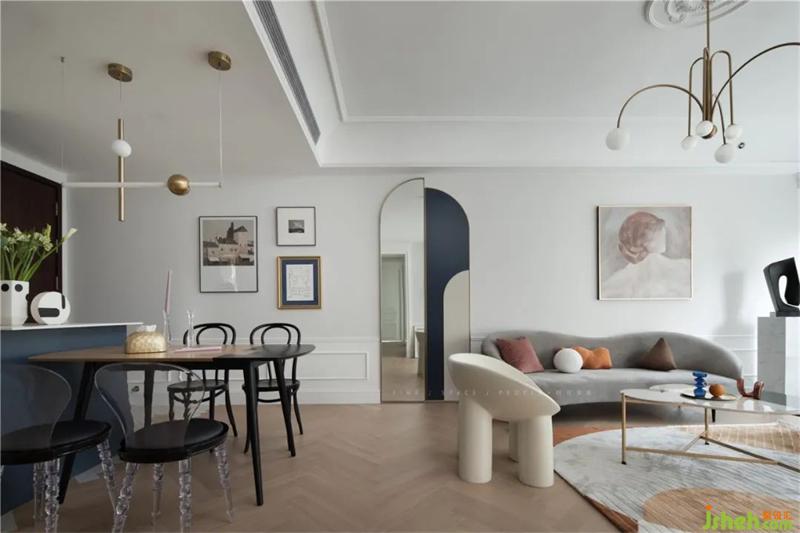 整面的沙发背景通过一个高低圆润的原创屏风,法式家居设计将餐厅空间和客厅空间巧妙的区分开来,屏风的局部镜面设计让屏风显得更加灵动,加强了走道空间的纵深感,当女主人从主卧一打开门,就像走T台秀一样,看见最闪亮的自己。