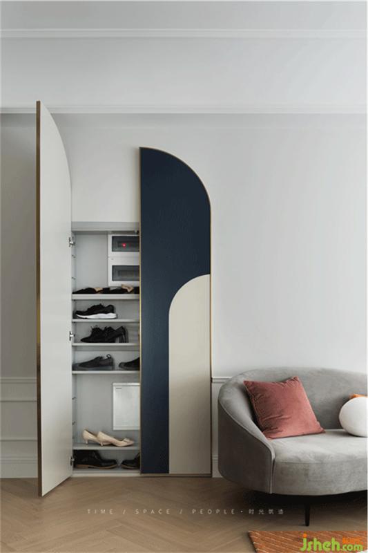 好吧,我要揭露这个案例的第一个机关,刚好这个位置是原来开发商预留的一个电箱位,我们巧妙的将它设计成一个特别的屏风,又是业主的第二个备用鞋柜,不然岛台的鞋柜是远远不够。