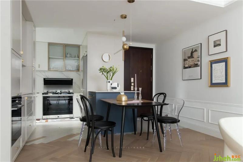 餐厅的全貌,可以看到地面的砖木交错铺贴让餐厅和厨房空间相互区分又相互融合,居中式餐桌排布,法式家居设计让空间流线达到最有效使用。唯一就是应该把入户门颜色也协调下就更完美了。
