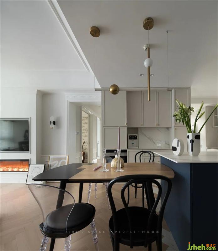 考虑到更好的打理,厨房和入户都选用了瓷砖。法式家居设计通过瓷砖和人字地板的相互交错,让整个空间的过渡变得更自然。印象派的法式城堡和蓝色边框的毕加索的抽象画和这蓝色的岛台相得益彰。