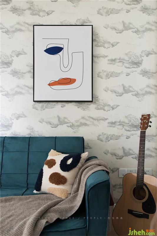 书房临近过道的门是两扇推拉的造型门,因为两边是墙,所以希望打开的时候门也是一个装饰,和墙面的墙纸,沙发能形成一个场景感。
