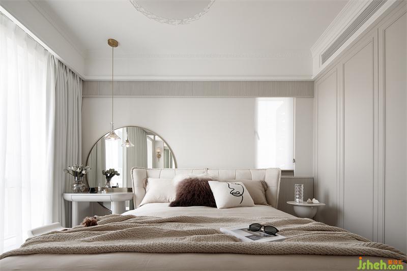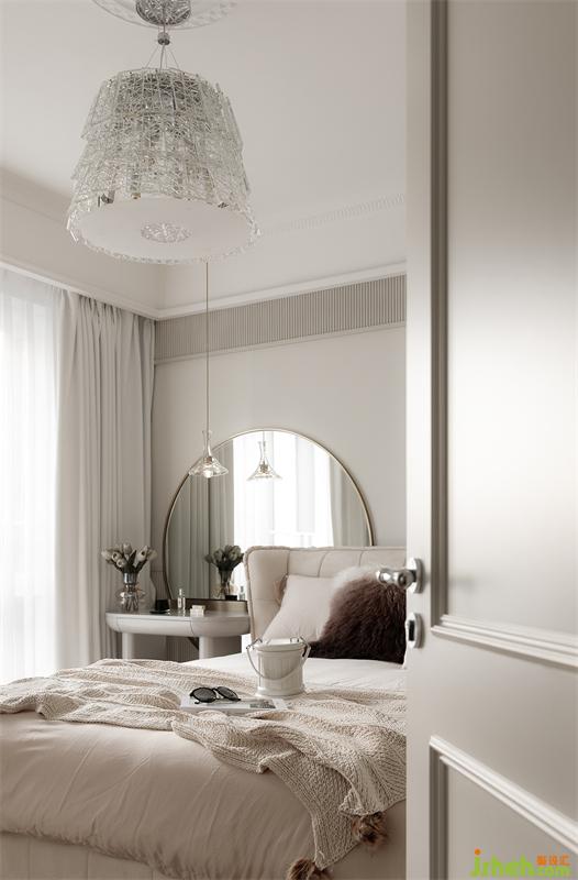 碎片形态的水晶吊灯,极具包围感的大床,粉色的床品,圆润的梳妆台,独具设计感的梳妆凳,心底的满足感犹如绵密的泡沫升腾起来,充盈而丰富。