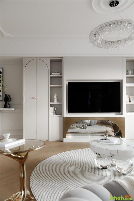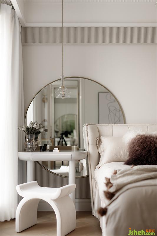 入门的第一眼视觉便停留在了这面圆形的梳妆镜子上,圆形的造型完美演绎出自然与艺术的结合。法式艺术设计更有趣的是这面镜子不但有梳妆镜的功能,还和洗手间洗手台的镜面遥相呼应,相互映射,形成无限延伸的趣味性和空间感。
