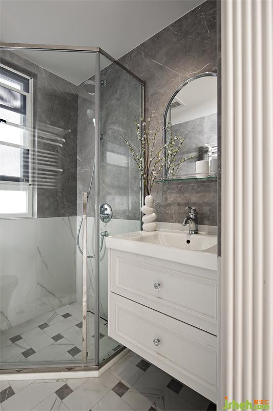 公卫做了独立的淋浴区,整体采用黑白灰基色系,颜色浅浅柔柔的变化,法式艺术设计大理石拼花地面与大理石墙面相融相合,让狭小的空间也能生动独特的体现出层次美。